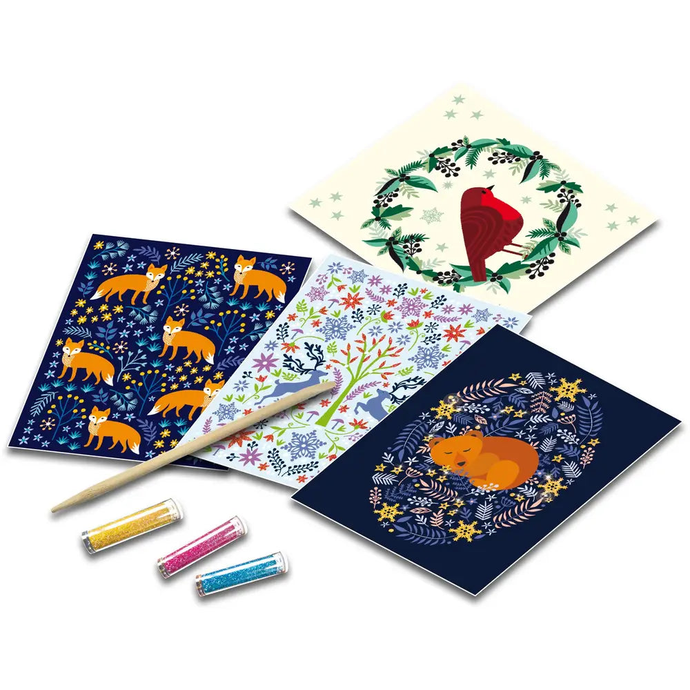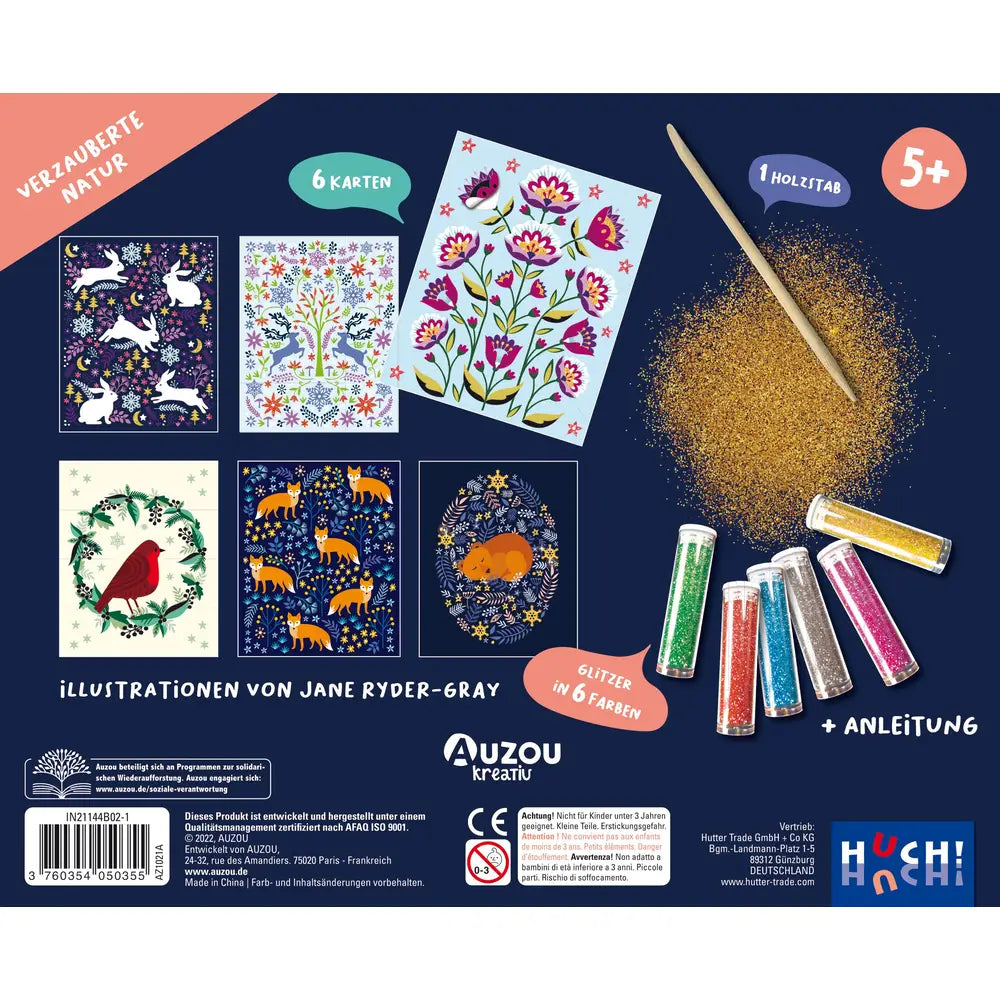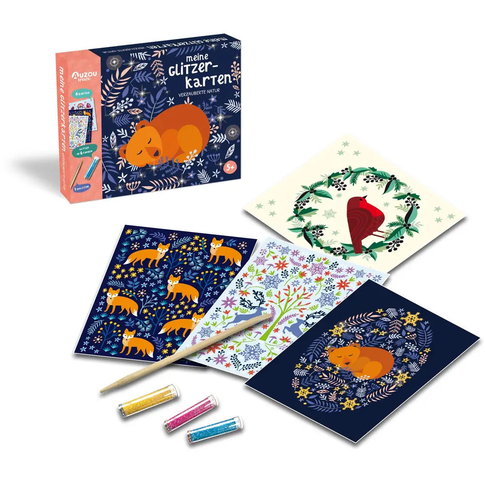 Ein Künstlerkoffer mit 6 Glitzertuben und 6 schönen geleimten Karten zum Verzieren. Eine einfache Technik für ein garantiert wunderschönes Ergebnis.
