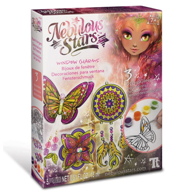 Inhalt: 13 ausgeschnittene Formen zum Bemalen, 5 Glasfarben, Pinsel, verschiedene Strasssteine, Perlen und Schnur.