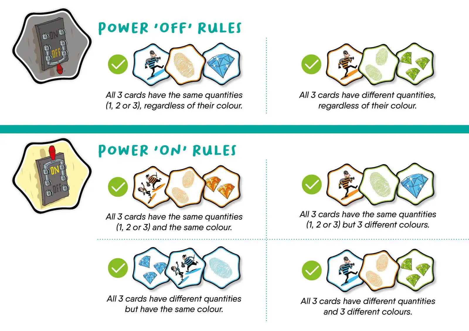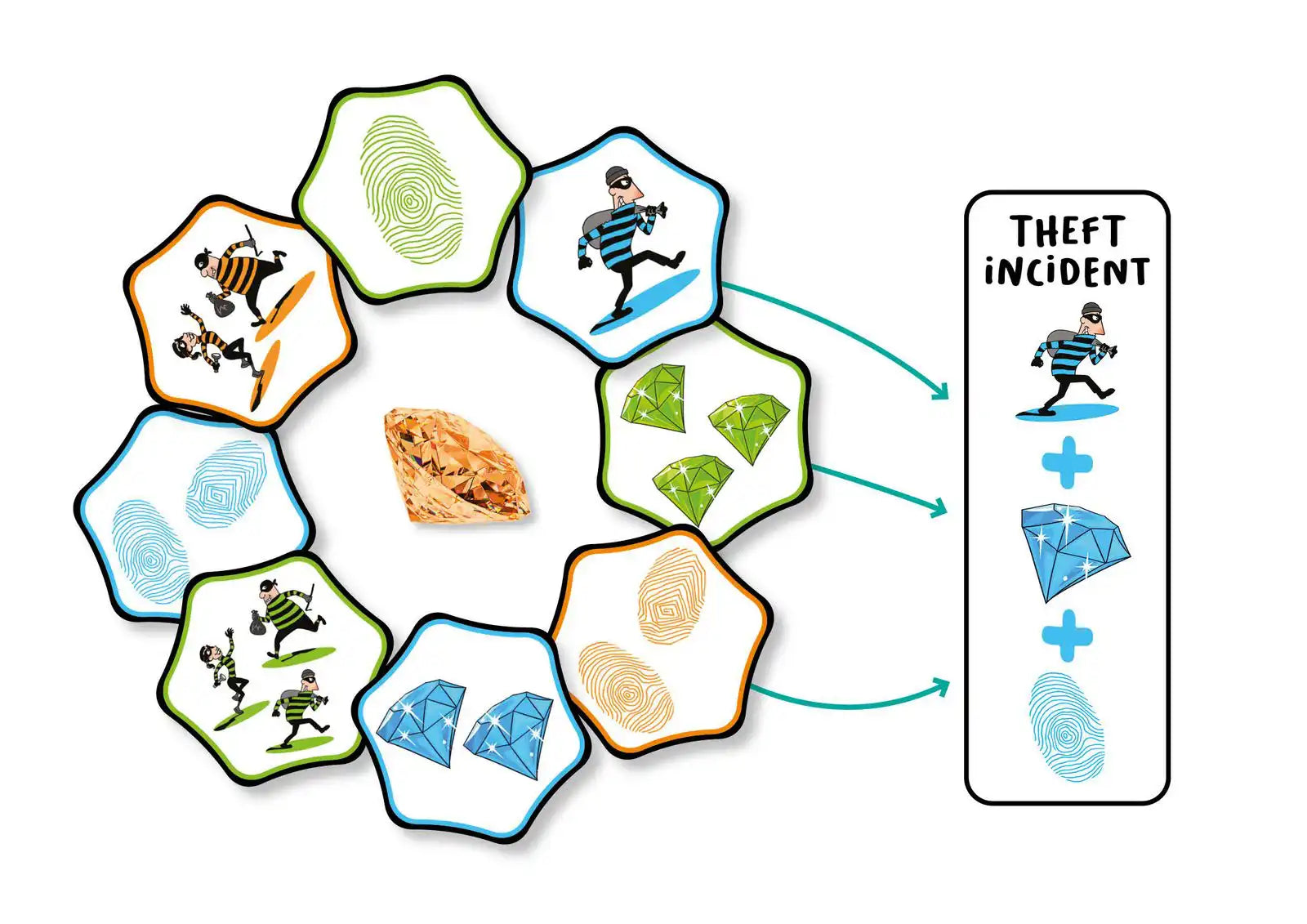 Entdeckt so schnell wie möglich eine gültige Kombination aus Diamant, Dieb und Fingerabdruck. Schnappt euch den großen Diamanten in der Tischmitte, klärt den Diebstahl und gewinnt die Kärtchen.