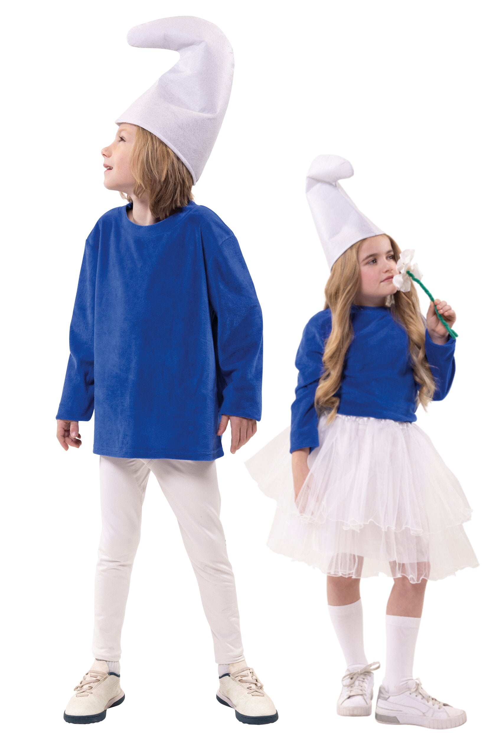 Blaues Langarm-Shirt aus Nicki-Stoff und weiße Mütze - unser Zwerg Smörfi kleidet sich ganz klassisch und ist besonders gern in Gruppen unterwegs! Das Kostüm ist für Mädchen und Jungen geeignet und kann ganz einfach mit einem weißen Tüllrock oder einen weißen Hose kombiniert werden. Die Mütze ist aus weißem Filz.