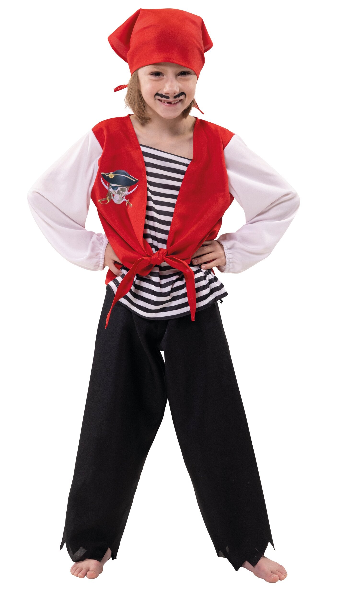 Dreiteiliges Piratenkostüm, bestehend aus Oberteil, Hose und Kopftuch. Das Oberteil hat lange weiße Ärmel mit Gummibündchen, ein schwarz-weiß geringeltes Vorderteil und eine uni rote Rückseite, die vorn über zwei rote Stoffeinsätze weitergeführt wird, so dass eine Westenoptik entsteht. Mittig hinten sowie auf der rechten Brust ist jeweils ein Totenkopf-Print mit gekreuzten Säbeln. Das Kopftuch hat Dreiecksform und wird hinten am Knopf geknotet. Die Schwarze Hose ist uni schwarz und ebenfalls gezackte Beinabschlüsse.