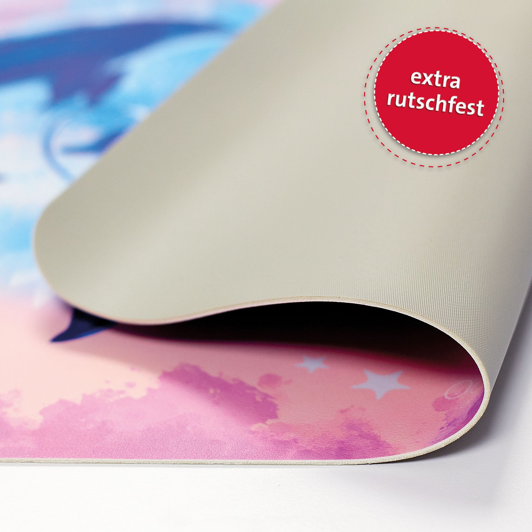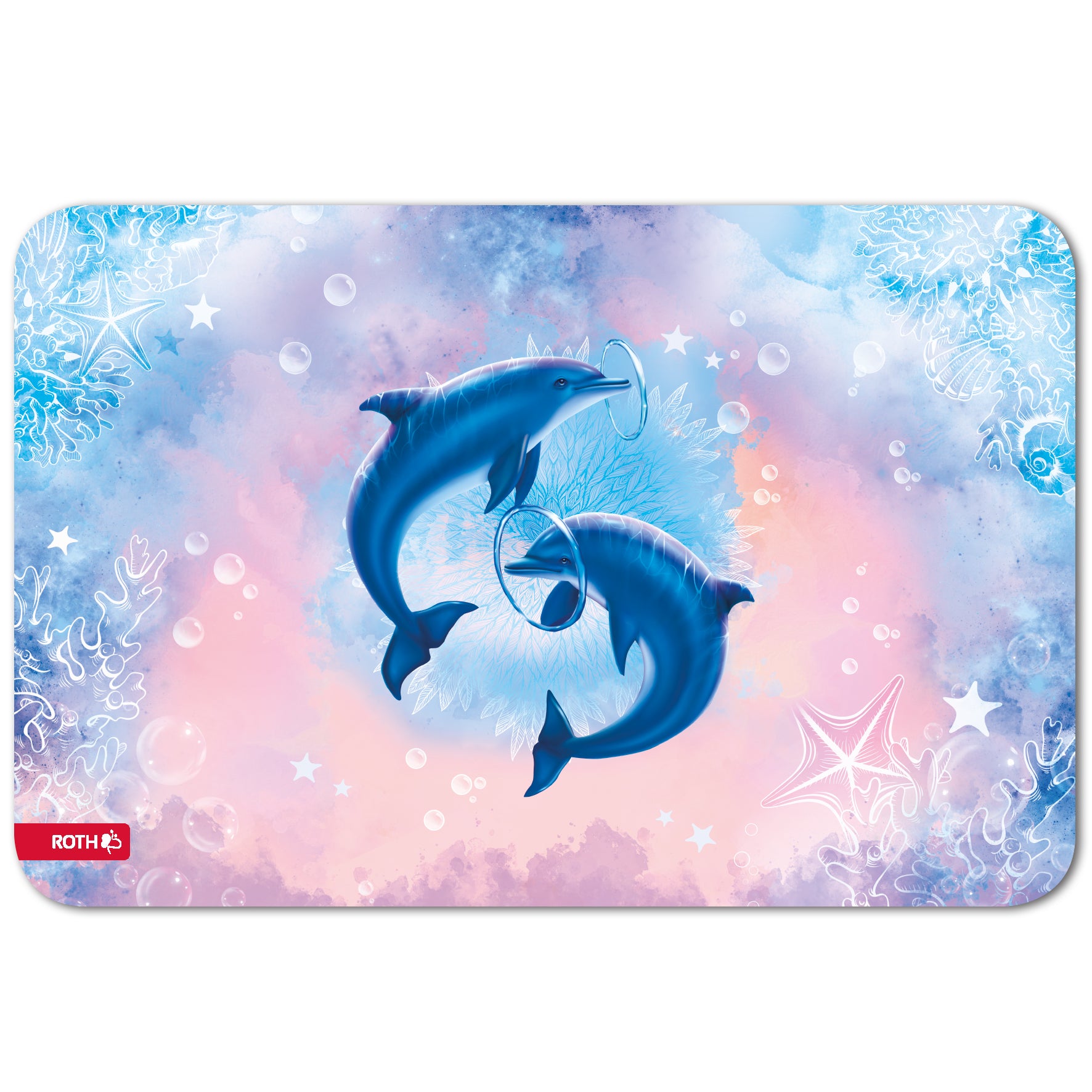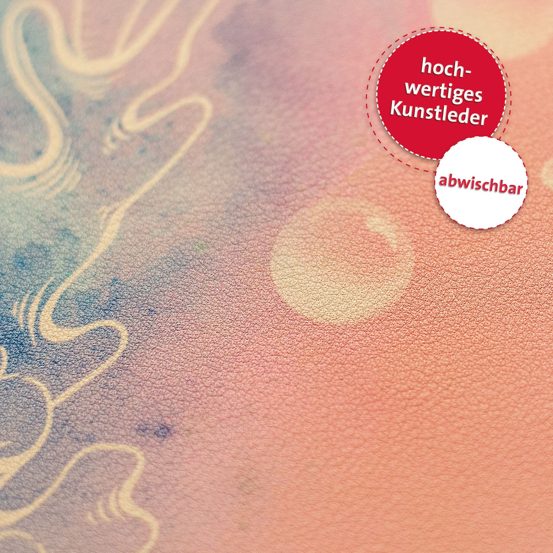 Zwei lustige Delfine tummeln sich zwischen Korallen und Muscheln. Das in zarten Rosa- und Blaunuancen gehaltene Motiv ist besonders schön durch zarte Details, wie vom Meeresgrund aufsteigende Blasen, und wunderschöne Sterne. Die neue Oberfläche und die Anti-Rutsch-Beschichtung auf der Unterseite sorgen für ein angenehmes Gefühl bei allen Schreib- und Malaktivitäten. Durch das abwischbare Material ist die Schreibunterlage leicht zu reinigen. Die Schreibtischmatte mit dem Unterwassermotiv schützt die Tischoberfläche vor Krazern und Flecken. Das Kunstleder dämpft den Lärm der Stifte und ist durch die hohe Qualität langlebig und multifunktional. Die rutschfeste Malunterlage passt garntiert in jedes Kinderzimmer und ist ideal als Geschenk für Geburtstag und Schulanfang.