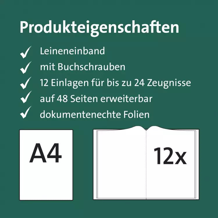 - durch Buchschrauben erweiterbar auf 24 Hüllen / 48 Seiten